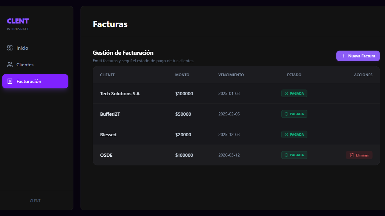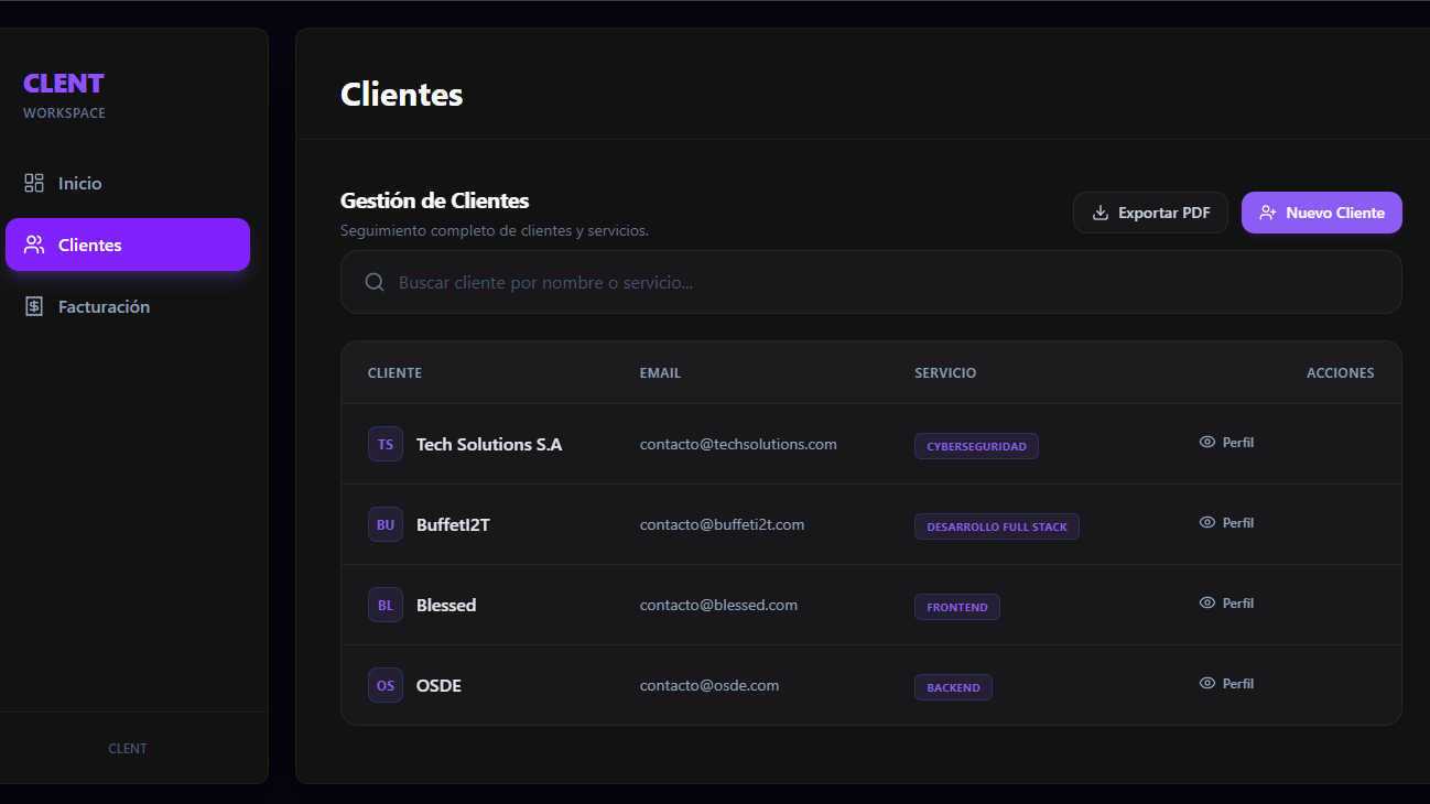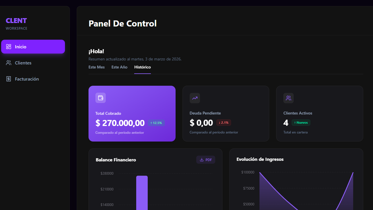 CRM financiero desarrollado como Single Page Application (SPA). Permite la gestión integral de clientes y facturación, destacando por su visualización de métricas en tiempo real con gráficos interactivos y la generación instantánea de reportes en PDF.